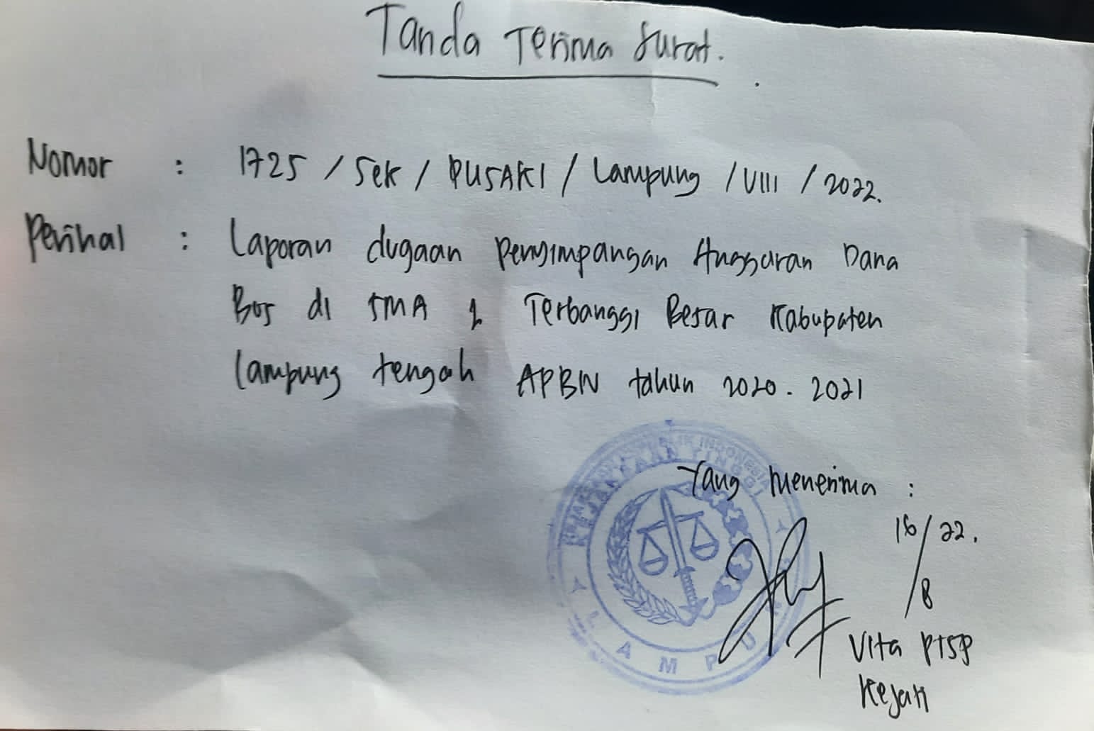Diketahui, sebelumnya penggunaan Dana BOS SMAN 1 Terbanggi Besar Tahun 2020-2021 baik dari kegiatan fisik dan non fisik sudah dilaporkan LSM PAKP Provinsi Lampung Fikri ke Kejati Lampung belum lama ini.