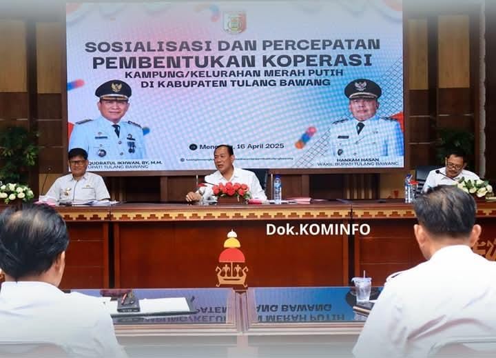 Alteripost Tulang Bawang – Pemerintah Kabupaten (Pemkab) Tulang Bawang (Tuba) melaksanakan sosialisasi Percepatan Pembentukan Koperasi Kampung dan Kelurahan Merah Putih di Sai Bumi Nengah Nyappur, Rabu (16/4/2025).