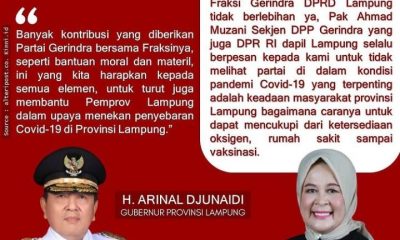 Alteripost.co, Bandarlampung- Gubernur Lampung Arinal Djunaidi tak segan memberikan pujian kepada Partai Gerindra karena telah bersinergi dengan Pemerintah dalam percepatan penanganan Covid-19. Apresiasi tersebut ia...