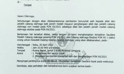 Alteripost.co, Bandarlampung- Pemerintah Provinsi (Pemprov) Lampung akhirnya telah mentransfer bonus atlet peraih medali Pekan Olahraga Nasional (PON) XX Papua ke rekening KONI Lampung yang akan...